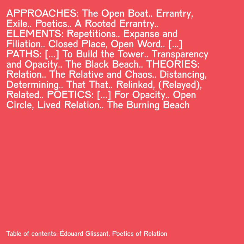 La question de la "RELATION" est le premier axe théorique qui nourrit les projets du CHO. Elle se concentre sur le partage de pratiques et de recherches performatives et chorégraphiques et sur la création d’espaces de travail non productifs. Elle vise à la création d’un espace de recherche qui mette en commun des corps en mouvement et leur physicalité, des conceptions philosophiques et poétiques et des approches politiques et engagées.